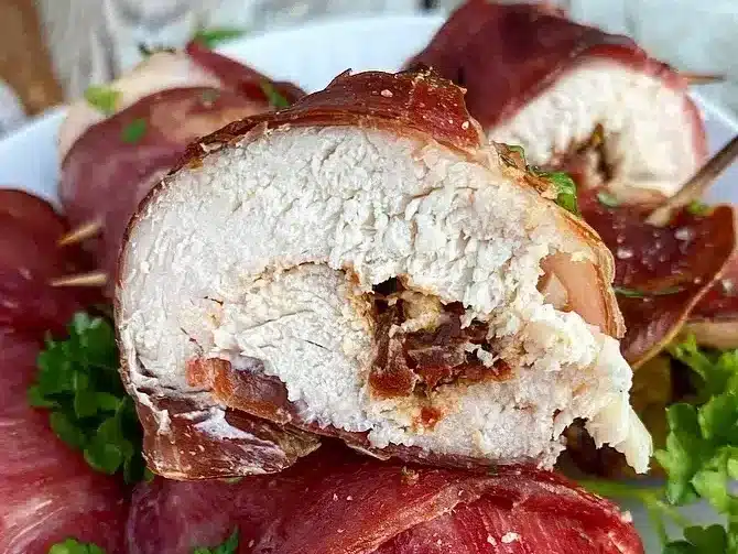 These chicken rolls are wrapped in bacon and filled with creamy, savory goodness. They’re great for dinner parties or when you want to make something special.