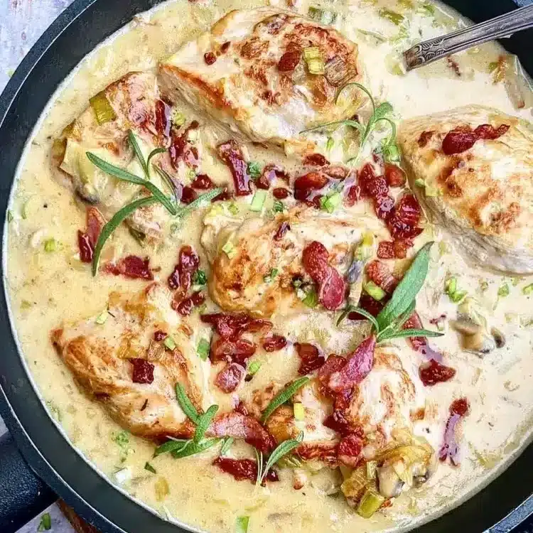This dish is creamy, rich, and full of depth thanks to the leeks and bacon. It’s an elegant yet easy recipe for everyday dinners. Pair it with mashed potatoes or pasta.