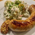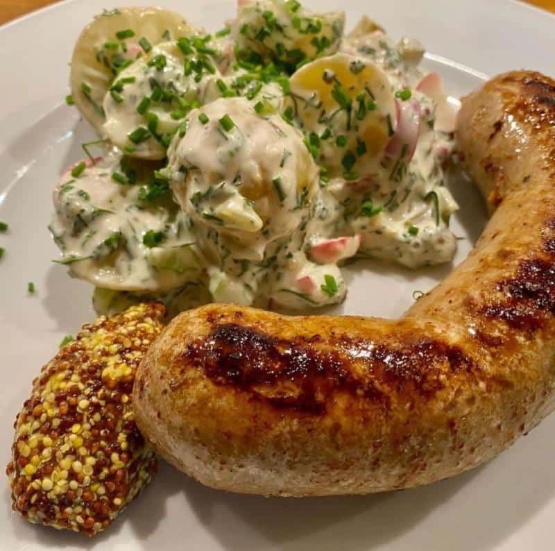 No sausage feast is complete without a great side—and James’ potato salad delivers big. New potatoes are boiled until tender and tossed with crisp radishes, crunchy celery, and finely chopped pickles. The dressing is a standout: a rich, homemade mayo lightened with yogurt and loaded with fresh herbs like dill, chives, and peppery watercress. The result is tangy, creamy, and packed with flavor—exactly what you want alongside smoky, savory sausages. It’s a perfect contrast in texture and temperature too, especially if you serve the salad chilled and the sausages hot off the grill. Bonus: this potato salad can stand on its own at any picnic or potluck, even if you don’t get around to making the sausages from scratch.