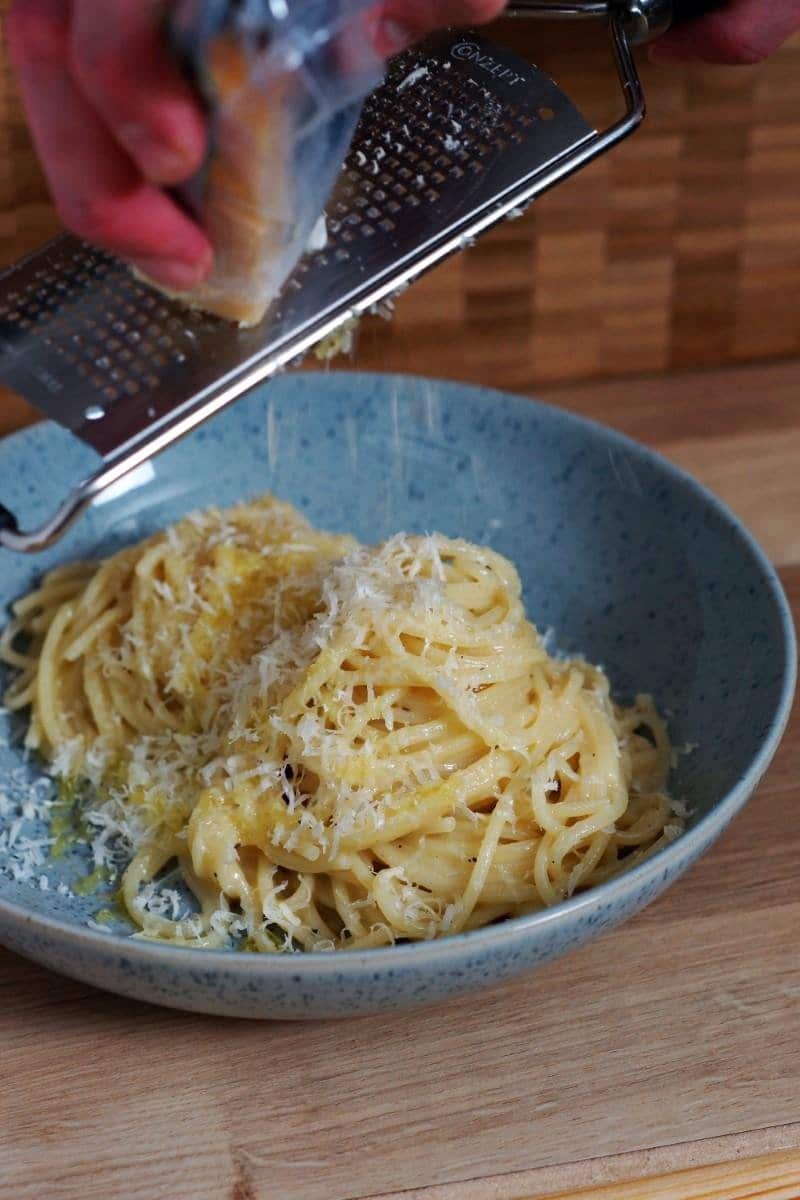 Cacio e Pepe is best served immediately, straight from the pan to the plate, while the sauce is still glossy and the pasta perfectly al dente. A final sprinkle of parmesan and a drizzle of olive oil elevate the dish even further. You can stick with tradition or use this as a base for variation: add a little lemon zest for brightness, toss in some sautéed mushrooms, or top with a poached egg for extra richness. While purists may insist on only pecorino romano, a mix of parmesan and pecorino also works beautifully. Serve it with a crisp white wine and you’ve got a meal that’s elegant, effortless, and authentically Italian.