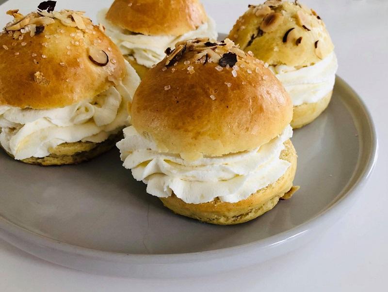 Delicious and delightful Shrovetide buns. These sweet yeast buns are sprinkled with pearl sugar and hazelnut flakes and filled with a luscious vanilla cream and marzipan whipped cream. It doesn’t get any more delicious. With vanilla cream and marzipan whipped cream