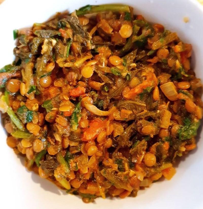 One of my favorite dishes is this Indian Palak. The dish is a vegetarian recipe with a base of red lentils and tomato.