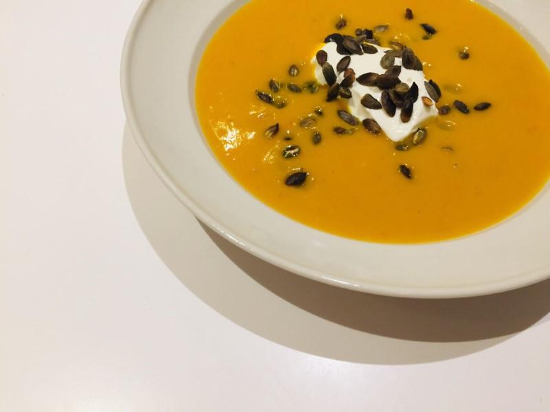 Creamy and rich pumpkin soup with crème fraîche and roasted pumpkin seeds. A delicious, hearty vegetarian dish for a cold autumn day.