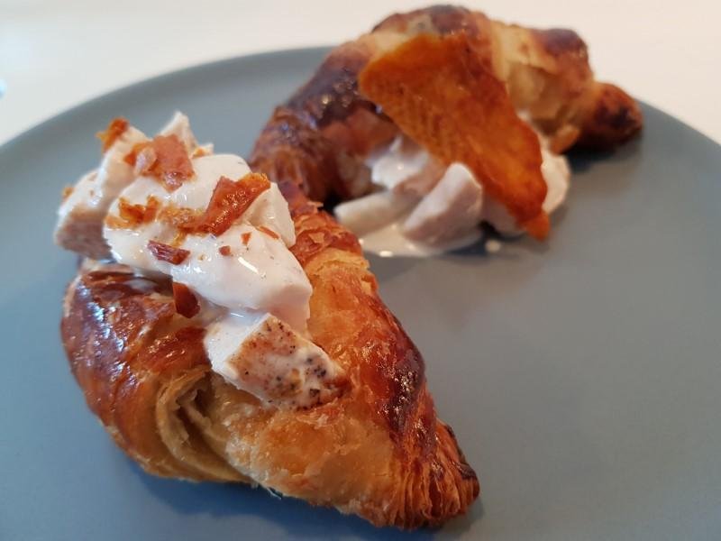 Homemade chicken salad with croissant and chicken skin