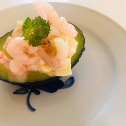 - Cut the avocados in half lengthwise and arrange with dressing and the rest of the shrimp.