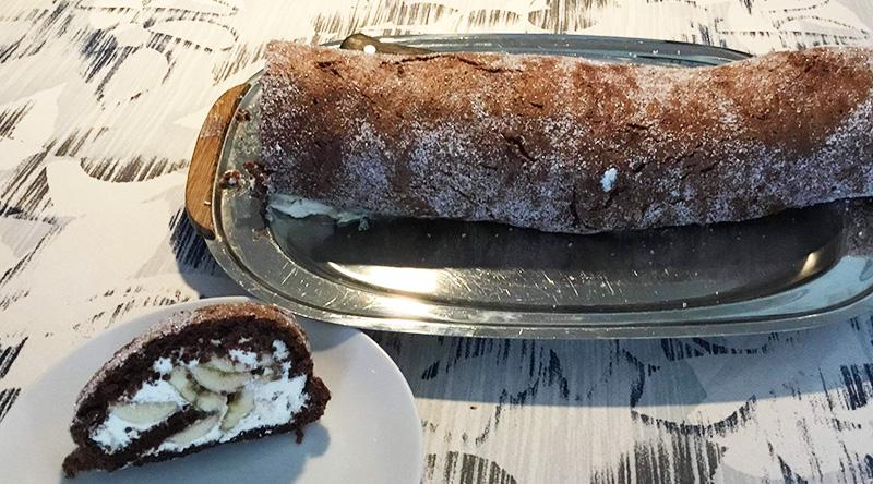 A light and delicious Swiss roll with a filling of whipped cream and bananas.