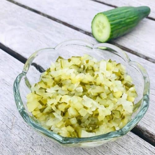 Cucumber relish is a delicious topping, for example on your HOT DOGS or sliced roll sausages. Super delicious and a quick little treat to serve with many dishes.