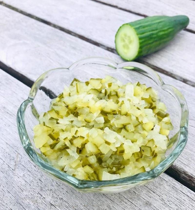Cucumber relish is a delicious topping, for example on your HOT DOGS or sliced roll sausages. Super delicious and a quick little treat to serve with many dishes.
