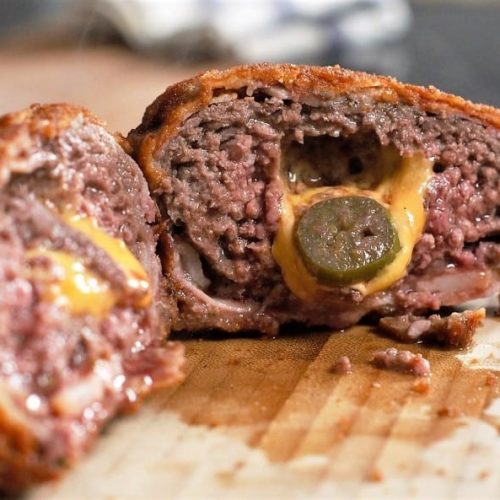 The recipe for deep-fried burger without a bun can actually be described as a crazy idea that ended up being a success. It was an idea that first arose in connection with us making 4 videos for our YouTube theme about deep frying. There was quite a bit of discussion about whether it would end up being a brilliant or simply just a bad idea to deep-fry a burger filled with pickled jalapenos and cheddar cheese and wrapped in bacon.