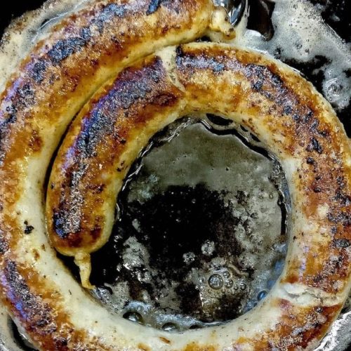- When the butter is done foaming and bubbling, place the medister on the pan!