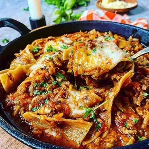 Here you get a creamy and flavorful lasagna stew filled with meat and vegetables. It undeniably resembles a regular lasagna – and yet it doesn’t, because this one is cooked entirely in a pot and is ready in much less time than an oven-baked lasagna. The lasagna sheets are simply placed directly into the pot and cook together with the sauce. Easy and delicious!