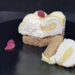 A fantastically beautiful and delicious cake that features all the best from the sweet kitchen: macaroon base, vanilla mousse, and balls of homemade lemon curd covered in a shiny yellow glaze.