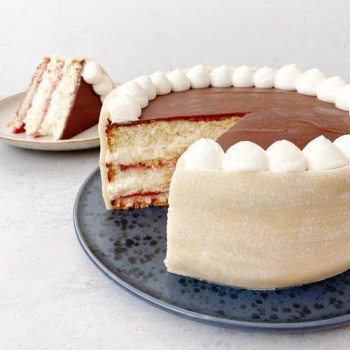 - Trim the marzipan ribbon, spread a bit of whipped cream on the cake, attach the ribbon, and finish with lovely whipped cream dollops.