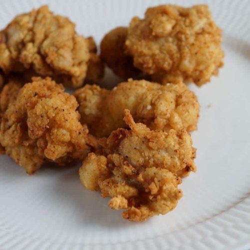 Put the chicken pieces in the hot oil and cook them for about 4-5 minutes. They should become crispy all around.
