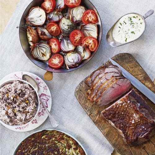 Enjoy slices of roast with baked onions and tomatoes, pieces of potato rösti and Parisian sauce.